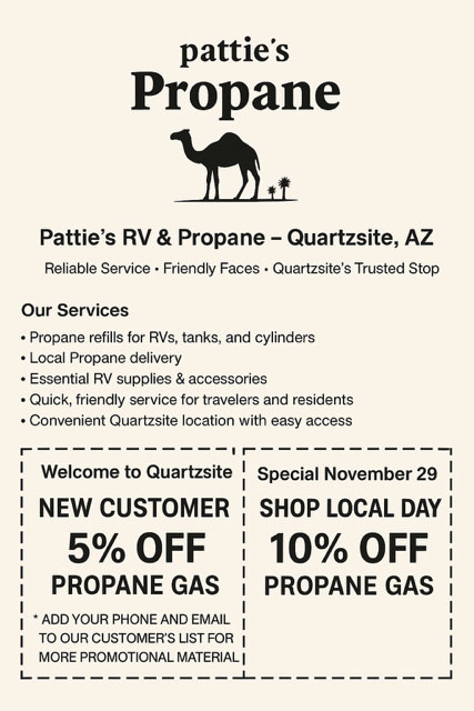 Pattie’s RV Park and Propane is a local propane provider in Quartzsite, Arizona. We provide propane pickup and delivery services to the Quartzsite residential and snowbird populations. Our current propane price, tank exchange, and tank buyback information can be found on our Propane Page.